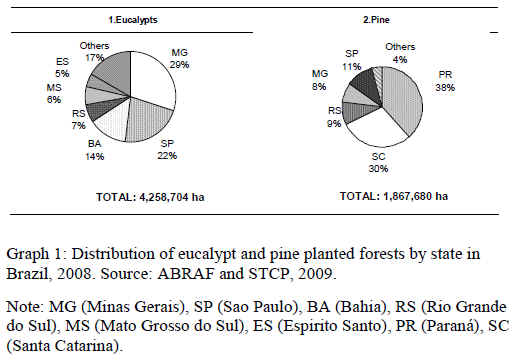 Forest plantations with eucalypts and pine were estimated at 6,126,000 hectares in 2008. Eucalypts accounted for 4,259,000 hectares, while pines accounted for 1,867,000 hectares. Graph 1 below shows the distribution of eucalypt and pine planted forest in the main Brazilian states.