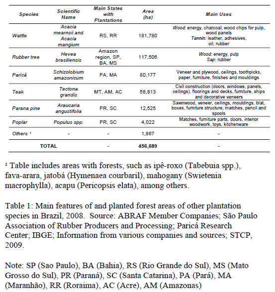 Although eucalypts and pine are the dominant planted species in Brazil, other species such as acacia/wattle, rubber trees, paricá and teak account for a significant part of the so-called other species. They also deserve attention due to their economic importance and recent expansion of their plantation area. Table 1 presents forest plantations areas and relevant aspects of other species planted in Brazil.