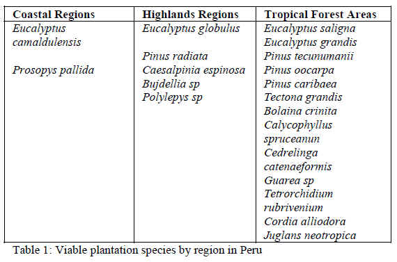 A number of geographical areas in Peru also have a great potential to be developed with plantations. In particular, the following are areas where plantations could be established: the Department of Pasco in Oxapampa; the Department of Junin in the Valley of the Mantaro, Satipo; the Department of San Martin in Tocahe, Tarapoto; the Department of Ucayali in Coronel Portillo; and the Department of Huanuco in the Code of the Pozuzo. The table below shows the type of plantation species that can be planted in Peru by regional ecosystem: