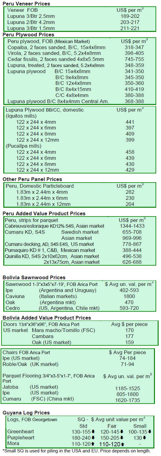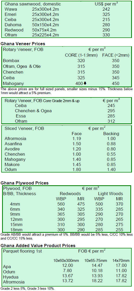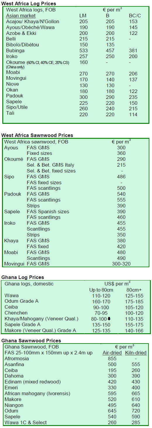 With the exception of Ghana and Cote d’ Ivoire, most efforts in the Central and West African forest sector have aimed to reduce log extraction and to certify forest areas. There is regular harvesting of plantations in Cote d’Ivoire; however, the competition for export from low cost lumber in South America has made the country’s plantation resources not financially viable at the present time. Nigeria also has some extensive areas of plantation teak and a very regular log export business, much of it reportly being regular shipments for Indian buyers at prices that remain very stable over long periods.
