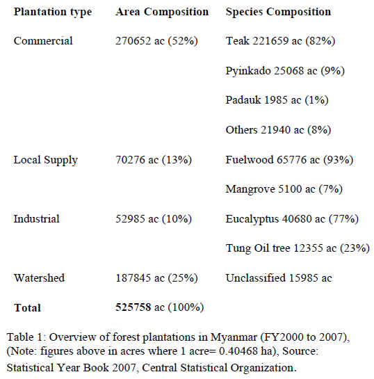 MYANMAR Myanmar promotes plantation establishment Plantations for commercial use, local supply, industrial use and watershed management have been established in Myanmar. Myanmar’s Statistical Year Book (2007) shows 525,785 acres of plantations were established from 2000 to 2007. Plantation type, area composition and species composition can be seen in the table below.