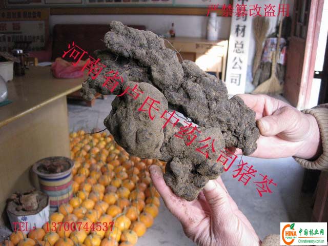 予西山区的老百姓称猪苓为“黑药”。有人在山上发现一窝“黑药”,挖了几编织袋,当时就卖给药贩子,得了几千元。众人红了眼,都上山寻挖“黑药”。在矿山打工的外地民工也成群接队去寻挖“黑药”。只几年时间,现在很难见到“黑药”了。人有病得吃药,药厂生产得有原药。这样,“黑药”价飘升,现在产地价100多元,药市价200元左右。这为人工种植提供了难得的好机遇,先下手为强,谁种谁赚钱。我公司郭黎明种的“黑药”就长得特别喜人。你若有意请来实地看看。种子现挖现供,现场示范,传授种植技术。