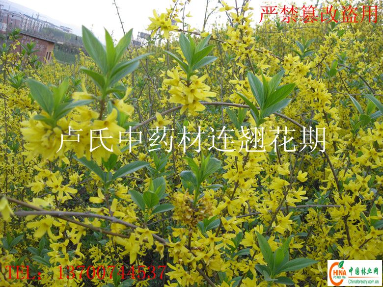 建国后,随着制药企业的发展,又加上青壳.连翘是大众通用药材,每年需用量很大。阳春三月,连翘花开,八百里伏牛山一片金黄。卢氏连翘面积之大,质量之优,产量之高,居全国之冠,而闻名遐迩。(2006年3月31日“河南日报”载,卢氏连翘占全国总产量的四分之一,行销20多个省,外贸出口到日本、马来西亚、新加坡、泰国和中国港澳特区。)04年卢氏连翘被国家定为唯一野生保护基地和地理性标志产品,05年又被国家定为国家级农业标准化示范项目。“拉连翘,上卢氏”。这是药商经常说的一句话。曾记得非典时期,经营药材者,因连翘一度高达每公斤60元,有人一夜成为百万千万富翁。06年北方八省发生倒春寒,出现高山区绝收,浅山区严重减产,造成了收不上青壳、连翘收叶子。这在当地历史上从无有过。07年同样出现倒春寒,即使侥幸躲过,后又是连续数月干旱,果实纷纷落地,几乎遭受灭顶之灾。有客商又来收购连翘叶,当地政府部门已采取措施严禁采摘连翘叶,以保护资源,对得起后人。家种连翘果大肉厚,比重高,药商争先抢购。栽植连翘,是一次投入,年年效益,绿色银行。亩产量600——1000公斤,平均市场销价18元左右,效益可观。有目光的人不是给后代留钱,而是留业,省得不成器者坐吃山空,就选中发展连翘种植业。栽植连翘不仅是发展药材生产,还能发展旅游产业,如我三门峡地区每年春天就有赏连翘花的盛会。卢氏连翘苗与南方连翘苗最大区别是不仅开花又能结果,还能长成大树。为了满足全国种植户的需求,我公司走公司加农户路子,有专业培育连翘苗圃地,挂果和不挂果苗均有。(四川南充地区营山县和辽宁锦州引种栽植,生长良好。)连翘适宜性强,全国大部分地区都能栽植。我们热情欢迎你前来考察,相互交流沟通,洽谈合作事宜。乘车路线:坐火车到三门峡西或灵宝下车,改乘大客到卢氏检察院下车,前方100米即到药市41号。不便来者,也可办理邮寄和铁路托运。