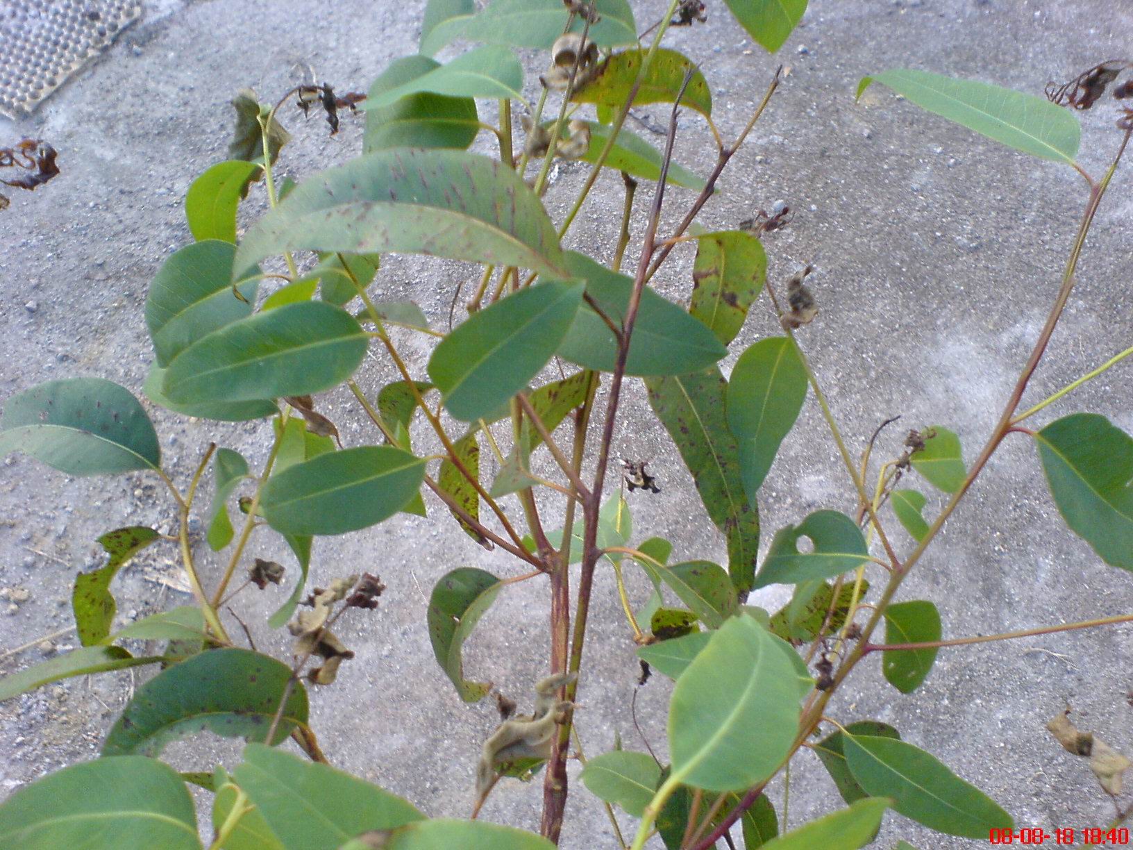 焦枯病: 1、症状:感病的叶片表皮变色,形成直径1.5~15毫米的斑点,病斑随后扩大为灰褐色的烫伤状,逐渐相互连接成较大病斑;病斑边缘与健康组织交界处呈灰绿色水渍状,边缘不规则,病斑很快干枯,导致叶片卷曲脱落。受害枝干最初可出现点状、线状或椭圆形的褐色斑,扩大后包围主干,病部溢缩,纵裂,最后导致枝干枯死。 2、防治方法: (1)一旦发现病害,要尽早处理,做到治小治少;(2)对初发病的少数病株,可修剪去出现病症的枝叶,带出林外烧毁;(3)发病区可喷70%甲基托布津1000倍液或其它杀菌剂,如落叶严重,可在药液内加入0.1%的尿素成混合液后喷施,要求全树枝叶全湿,均匀给药,6小时内无雨水冲刷;(4)干旱缺水林区可用70%甲基托布津按1:50的比例加入优质滑石粉内拌匀后,选择毛毛雨,大雨后,或清晨露水未干之前进行喷粉作业,要求尘粉覆盖树冠,喷后6小时内不被雨淋;(5)发病区的次年应及早追肥,以利树势的恢复和增强抗病能力。