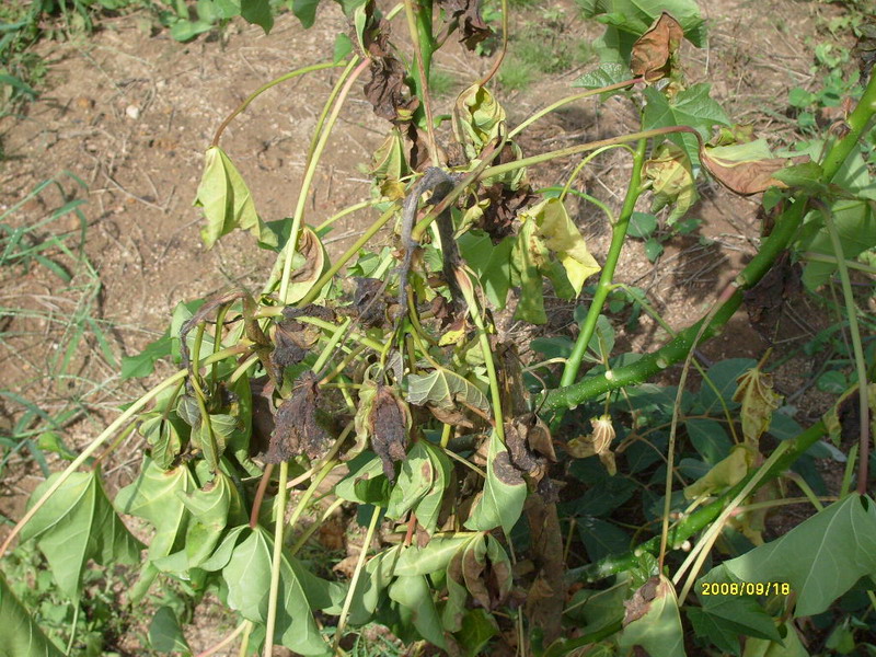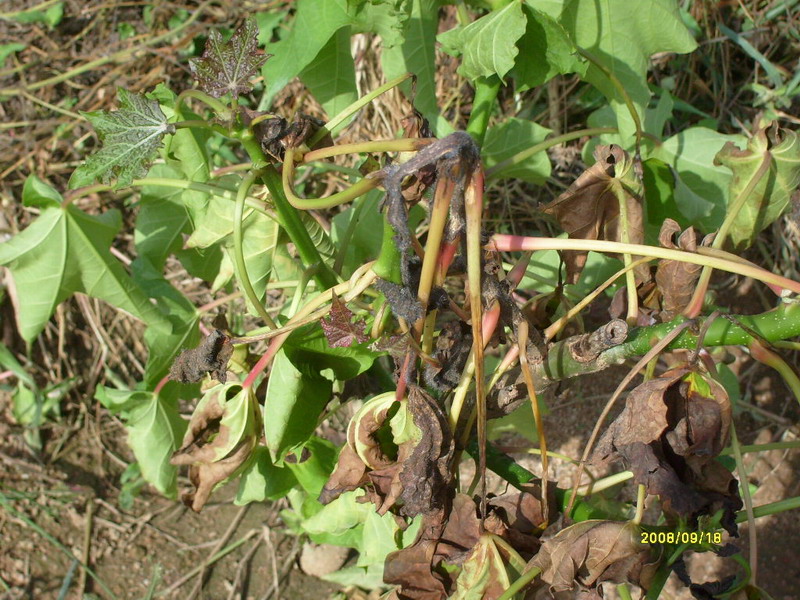不同的苗木感病后,其症状不尽相同,但一般表现为茎腐。如银杏苗一年生苗感病后,初期症状是茎基部变为褐色,叶片失去正常的绿色,稍向下垂,病部迅速向上发展后,全株枯死,叶片下垂不脱落。病茎皮层肥肿皱缩,表皮组织腐烂呈海绵状或粉末状,病菌浸入木质部,使髓部变为褐色或中空。病害扩展至根部后,使根皮层腐烂,如拔除疫苗,仅能拔出木质部而根部皮层则会留在土壤中。二年生苗木感病或一年生苗木发病轻的,病苗地上部部分死亡,当年可从基部发生新枝。炎热的夏季,土壤温度升高,当苗木茎基部受高温灼伤时,病菌便侵入危害。若苗圃地低洼易积水,苗木生长瘦弱发病率会显著增加。据观察,苗木一般在梅雨结束后10至15天开始发病,以后发病率逐渐增加,至9月中旬停止发病。