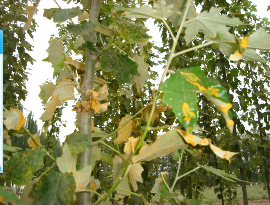 新疆杨叶锈病俗称黄粉病,是转主寄生的真菌病害,即一年中不同时期可分别侵染新疆杨树叶片和落叶松针叶。在新疆杨树上为害使叶片枯黄,甚至整株死亡。该病发生普遍,雨季发病严重。从小苗到大树都能发病,以小苗及幼树受害严重。病菌侵入后先在叶背面出现桔黄色丘疹状斑,继而出现桔黄色粉,最后叶片变黑,引起落叶、枯梢。